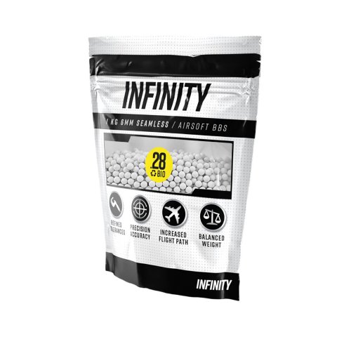 The Infinity 0.28g biodegradable airsoft BBs are precision 6mm BIO BBs from Taiwan that are highly polished and seamless BBs for 6mm airsoft rifles and airsoft pistols. Their ball bearing quality precision gives the flight path greater accuracy and consistency. Our BIO BBs are made from PLA (Polyactic Acid), which is recyclable and compostable thermoplastic derived from a renewable, earth friendly resource, such as corn starch. The Infinity airsoft BIO BBs are packaged in a 1 kilogram resealable bags. We recommend our Valken M4 Magazine Style BB Speed Loader for use with Infinity BBs when loading mid-cap magazines.