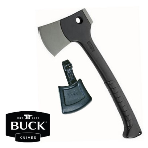 Buck Knives - Camp Axe with High Impact Molded Plastic Handle. Model BU757BK. 13" overall. Powder coated carbon steel axe head with 2 7/8" cutting edge. High impact molded plastic handle with lanyard hole. Black molded nylon blade guard. Made in Taiwan.